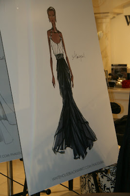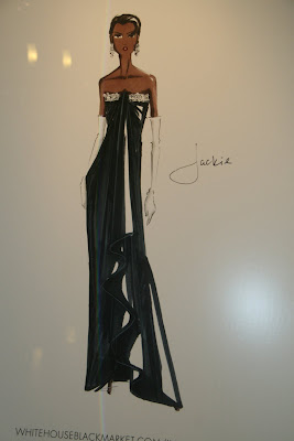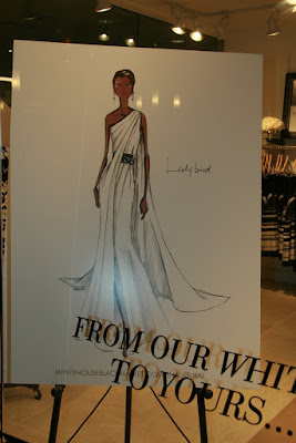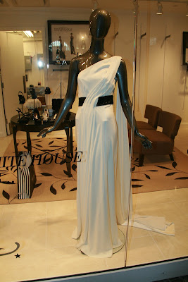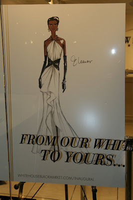 Inside, store clerks were dressing mannequins in inaugural gowns and putting out party frocks that fashionistas are likely to wear to a cocktail or ball. I saw four sketches in the window with labeled with the names of four first ladies. I switched into reporter mode and asked the sales lady through the glass doors what the gowns were for. She informed me that the four gowns are up for auction at Clothes Off Our Back.org, a site where celebs auction off their clothes, jewelry and other things for charity. The gowns are on display at the store inside Union Station and are being auctioned off right now until January 16. FYI: The WHBM at Union Station is the ONLY store displaying the dresses.