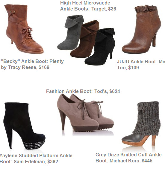 This season, heeled ankle boots come in all colors, materials, styles, and best of all…price ranges. Some of my favorites, below:
